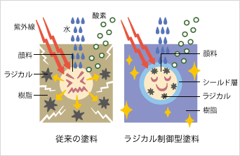 一般塗料の顔料の主成分である酸化チタンは、紫外線・酸素・水の影響を受けると塗膜樹脂の劣化因子「ラジカル」を発生させ、周囲の樹脂を破壊・劣化させてしまいます。
